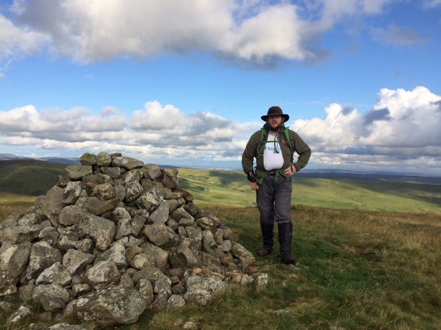 With the day coming to an end there was a large due south stretch which being up on the hill meant that we were in prime evening sun territory and I knew that I would be sun burnt when we got in. The stretch finished by this Cairn which seemed like the perfect opportunity to sport my Barclays t-shirt. After all they have agreed to match any funds that I successfully raise for 2nd Dukinfield. The view from the Cairn was pretty amazing but it is clear that the sun is setting out over Byrness resevoir.